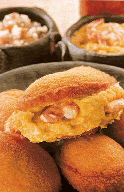 Os bolinhos, depois de fritos, são colocados em papel absorvente para absorver a gordura excedente e partidos ao meio. Então coloca-se o recheio no interior , constituído por um camarão seco envolto em uma colher de vatapá ( outra comida de origem africana) e molhado com o molho de camarão.