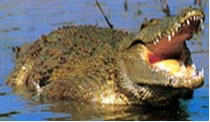 O crocodilo estava justamente dormindo a essa hora. Quando acordou, ele bocejou , abrindo a grande goela, limpou seus olhos, coçou as costas em uma velha raiz e se aproximou da margem para comer. Ele abre a grande goela, esperando que algum fruto lhe caia. Bum ! Alguma coisa caiu. O crocodilo a morde com um enorme apetite - e fica feliz porque não quebrou todos os seus dentes !
